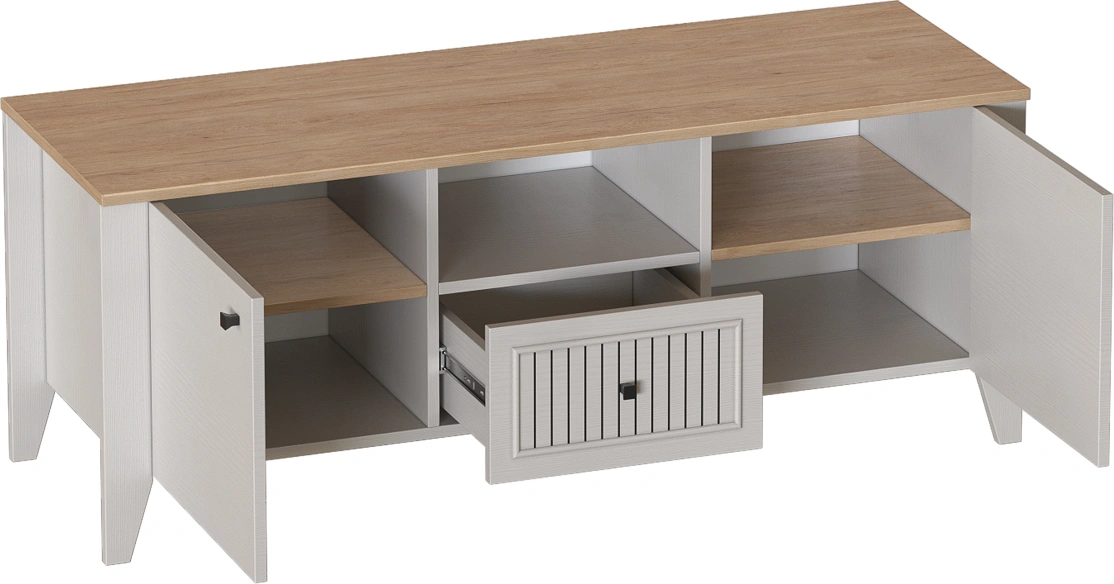 Тумба ТВ "Валенсия" выполнена в комбинации Дуб натуральный светлый / Персидский жемчуг и оснащена одним ящиком на шариковых направляющих (без амортизаторов). . Она выполнен из безопасных, качественных материалов, что гарантирует долговечность и сохранение первоначального вида на протяжении долгого времени.