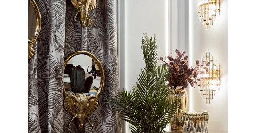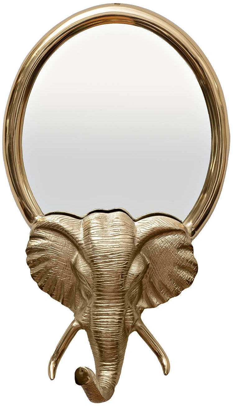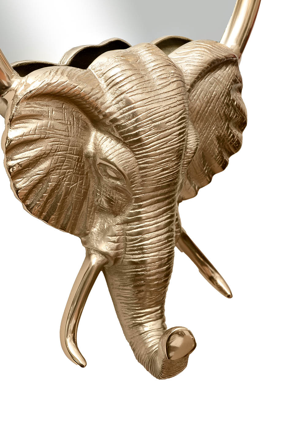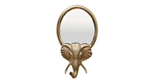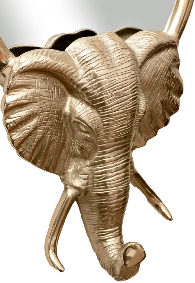 Декоративное настенное зеркало оформлено в лучших традициях стиля ар-деко. Главным акцентом выступает рама с головой слона, выполненная из позолоченного металла. Именно она делает это необычное зеркало эксклюзивным предметом интерьера, который никогда не останется без внимания. Оно будет органично смотреться в гостиной, спальне, будуаре, прихожей, подойдет для статусных интерьеров, в которых важно наличие дизайнерского декора высокого качества. Стильное эффектное зеркало ар-деко добавит шика, блеска и элегантности обстановке. Оно станет отличным подарком и сохранит первоначальную эстетику долгие годы.
