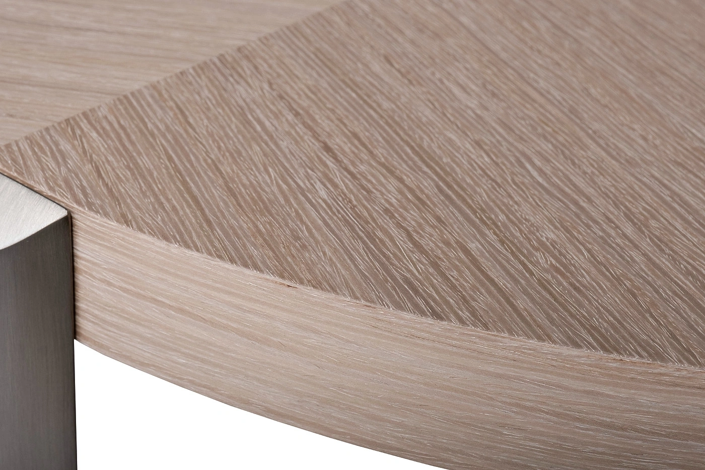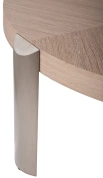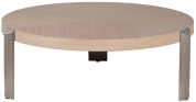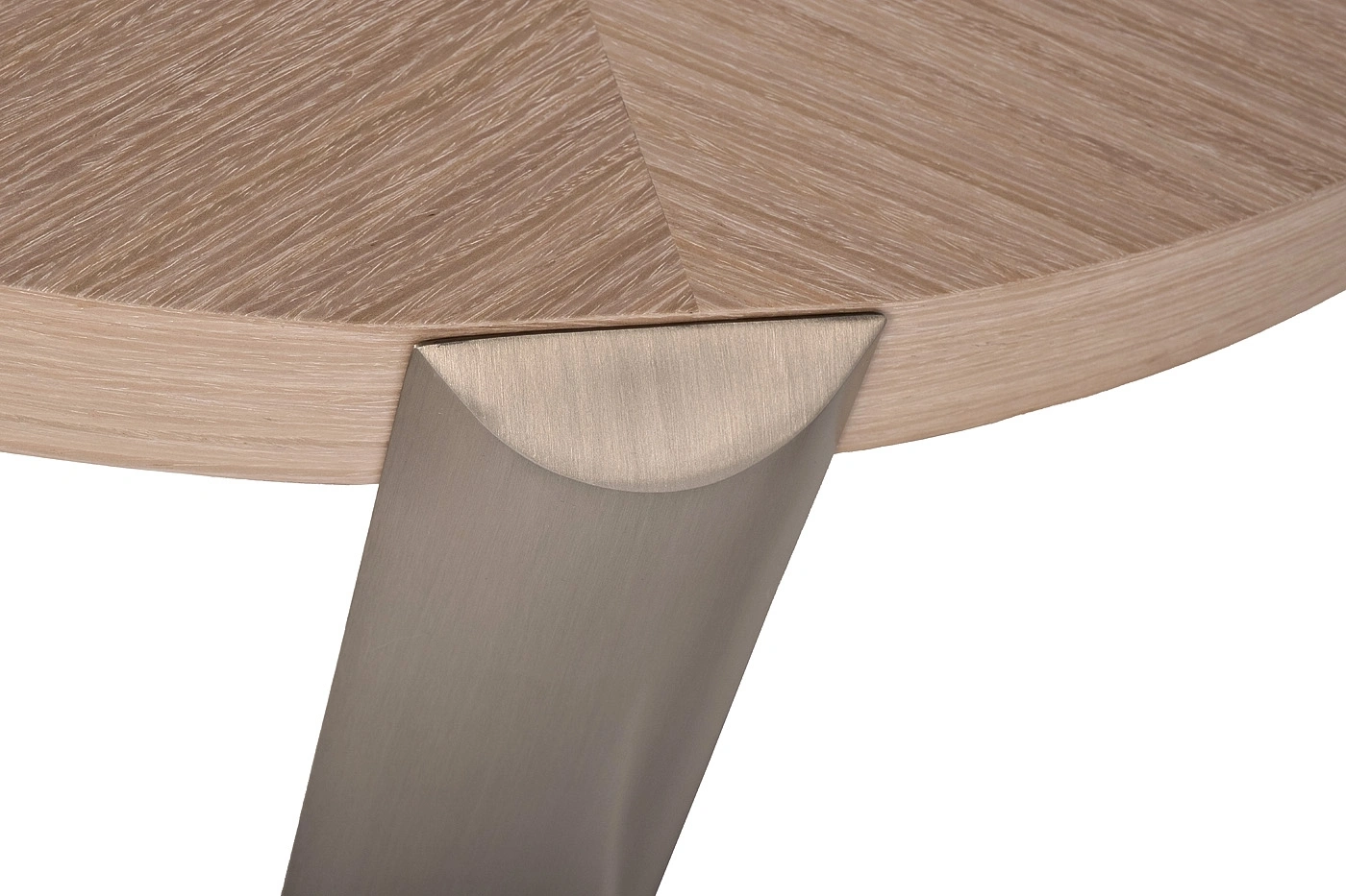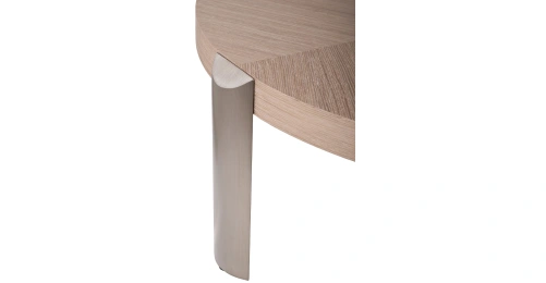 Элегантный журнальный столик с низкой круглой столешницей станет изысканным дополнением гостиной или холла. Столешница выполнена из МДФ, отделанного светлым шпоном с красивым рисунком древесины. Опоры столика, выполненные из металла цвета матового серебра, придают ему утонченный и современный вид.
