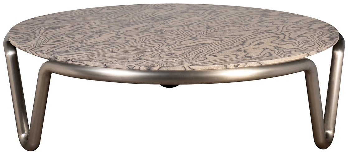 Этот круглый кофейный стол представляет собой не просто предмет мебели, а скульптурный элемент, способный тонко преобразить атмосферу любого пространства. Его столешница из натурального шпона с гипнотическим рисунком прожилок в духе Соттсасса создает ощущение теплоты и природного артистизма. Изящное, плавно изогнутое металлическое основание вторит округлым линиям верха, подчеркивая органичные формы и придавая всей конструкции визуальную лёгкость. Размещённый в гостиной, этот стол станет центром притяжения для взгляда, не доминируя, но уверенно заявляя о своем присутствии. Его низкий профиль идеально подходит для современных интерьеров, где ценятся открытость, простор и непринужденная элегантность. Игра света на текстурной поверхности шпона и блестящем металле добавит динамики, превращая функциональный предмет в постоянно меняющийся арт-объект.