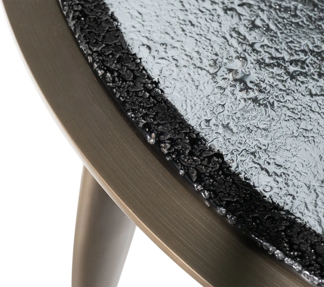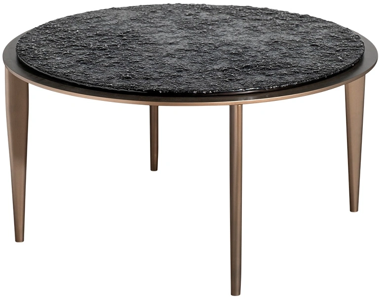 Журнальный стол круглой формы — скульптура для пространства, где природа и металл вступают в диалог. Его столешница из чёрного стекла с фактурой, напоминающей застывшую лаву или древнюю скалу, — не просто поверхность, а живой рельеф: каждый перепад света подчёркивает глубину, каждая трещинка — уникальный узор. Тонкие ножки из матового металла цвета античной бронзы расходятся от центра, как лучи, создавая ощущение невесомости — будто стол парит над полом. Круглая форма мягко обволакивает пространство, делая его дружелюбным и уютным. Идеален для интерьеров в стиле ар-деко или фьюжн — где круглый журнальный стол становится акцентом без кричащих форм. Это дизайнерский журнальный столик, в котором функциональность скрыта за эстетикой. Журнальный стол со стеклом — не просто предмет мебели, а художественный элемент, способный задать настроение всей комнаты.